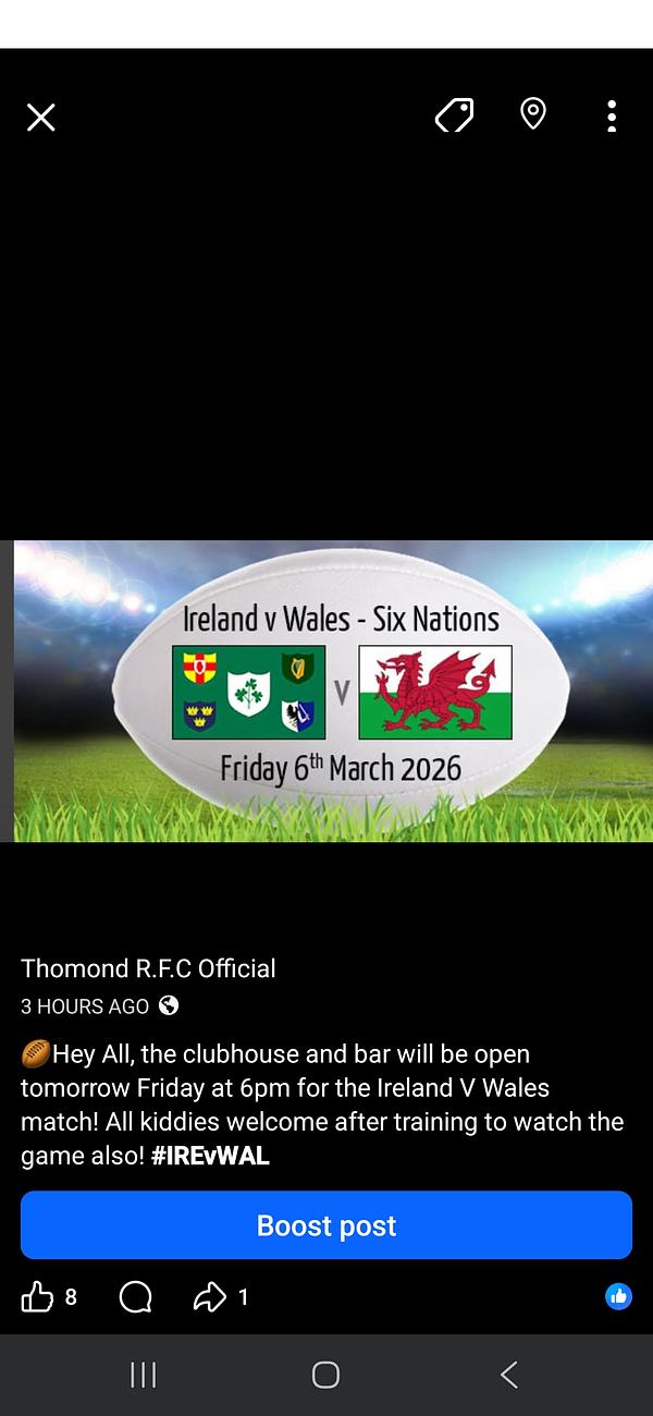 The clubhouse bar will be open tonight from 6 for the Ireland v Wales game. All kiddies welcome after training to watch the game also.